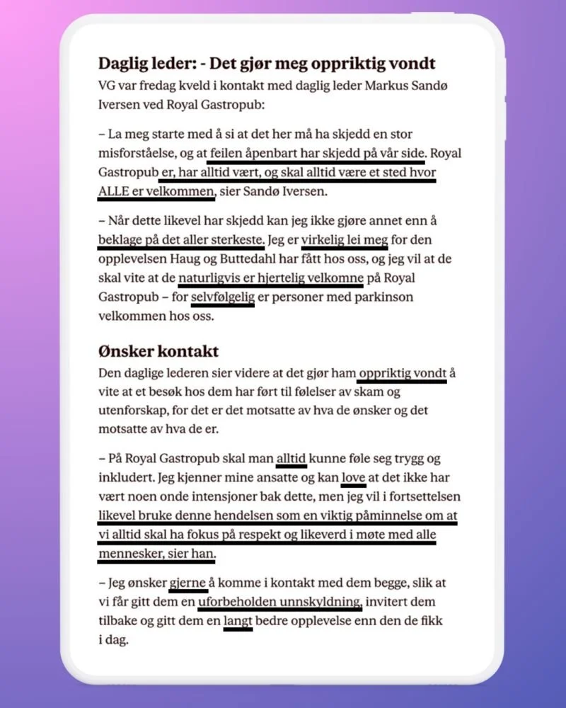 Videre. Han sier ikke bare at Royal Gastropub er et sted hvor alle er velkomnne – han understreker at det gjelder både i fortid, nåtid og fremtid. Merk også formuleringen «alle er velkomne». Det fastslår at noe er gyldig: Alle er velkomne. Det står i kontrast til om han hadde sagt at «alle skal føleseg velkomne», som i sin tur hadde dyttet ansvaret over på gjestene.